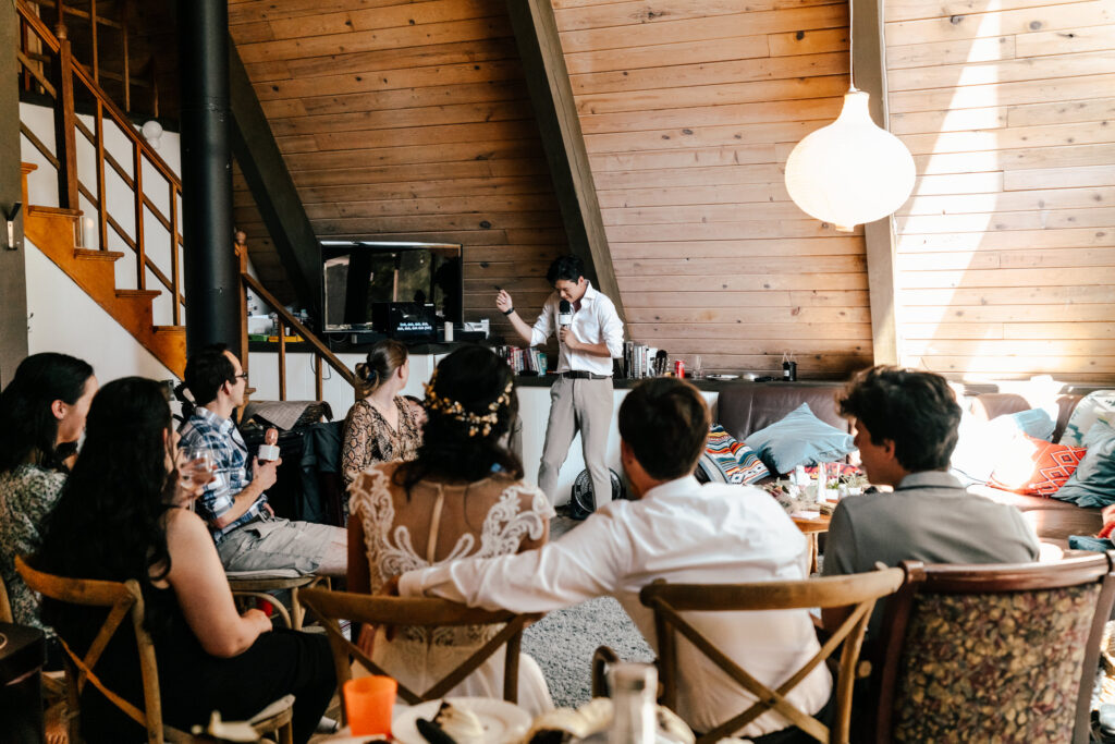 We met M+M at their adorable A-frame cabin located in the middle of Packwood, Washington. It was an early and quiet 5 A.M. start as they each got ready in separate rooms of their cabins, surrounded by their friends. The morning was filled with quiet conversations and excitement.