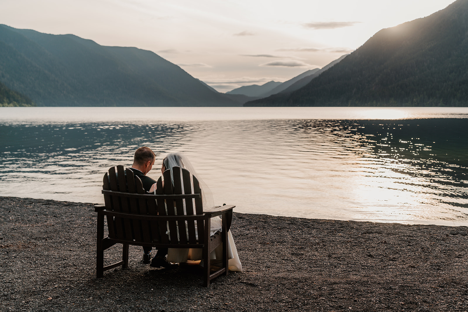 But here’s the magic of timing their elopement ceremony for just before golden hour: The stretch of shore they wanted for their Lake Crescent wedding has a stunning view of the western mountains, which means sunset happens behind those mountains. It makes the water look absolutely electric. We’re talking that golden, glowing, cinematic kind of light that makes everyone stop and stare.
